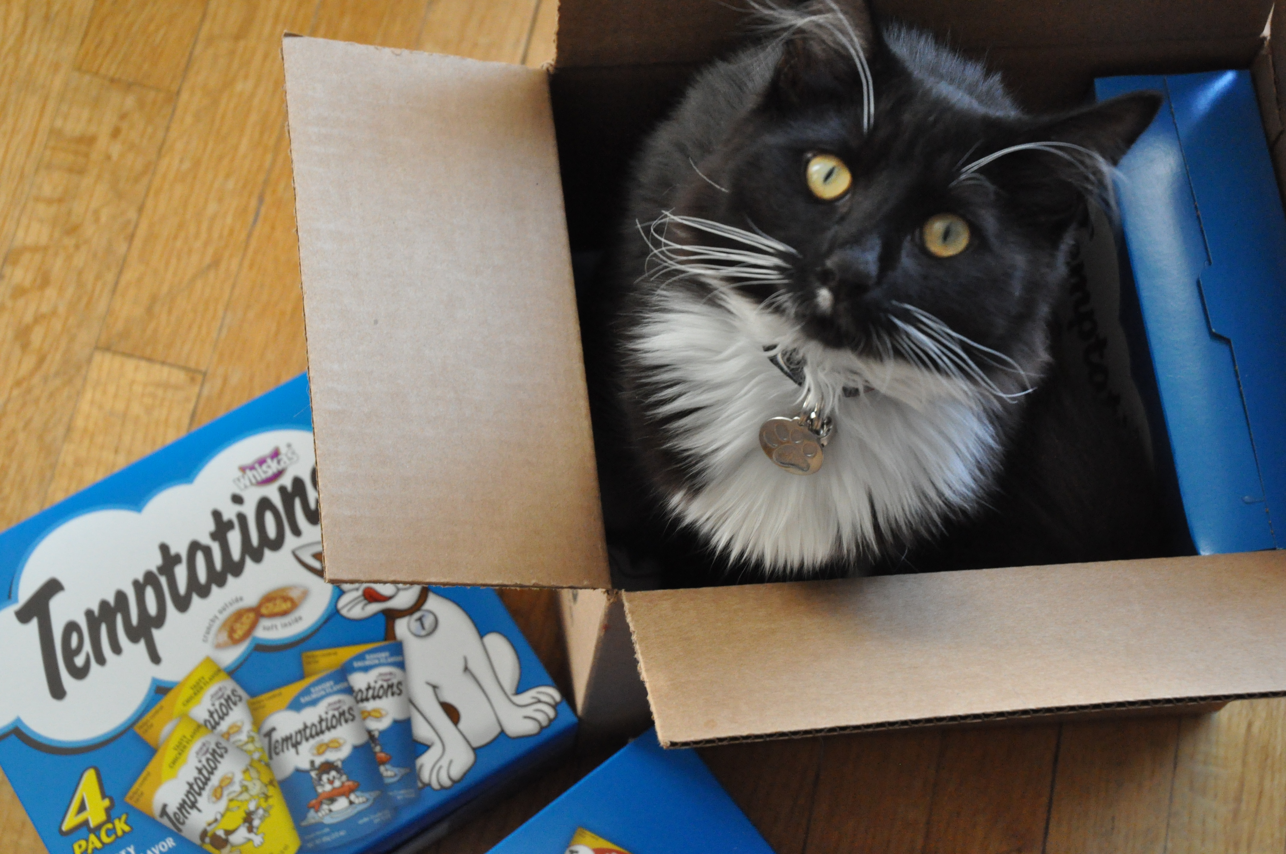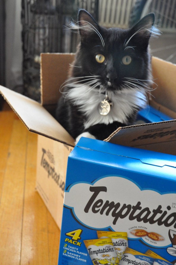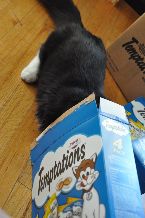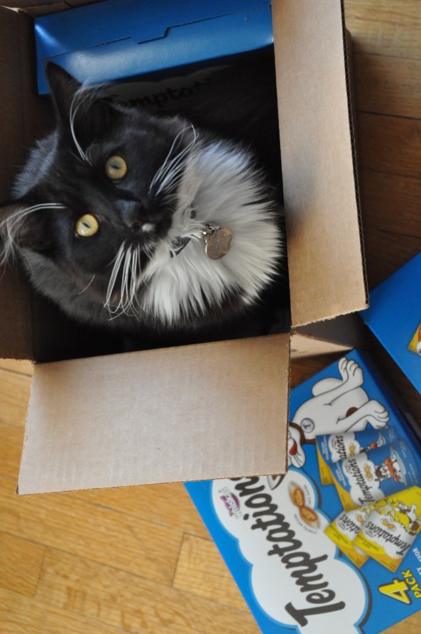 And today Boomer got his first present (I did say he was a popular kitty!!) which was a HUGE box of kitty treats courtesy of our good friend Livvy (aka Smiley_FacEsS on Twitter) …so we obviously took some pics, not only as a Thankyou to Livvy (thankyou, thankyou, thankyou) but so that you can all bask in the warm glow of an explosive little kitty when faced with an insurmountable amount of treats!