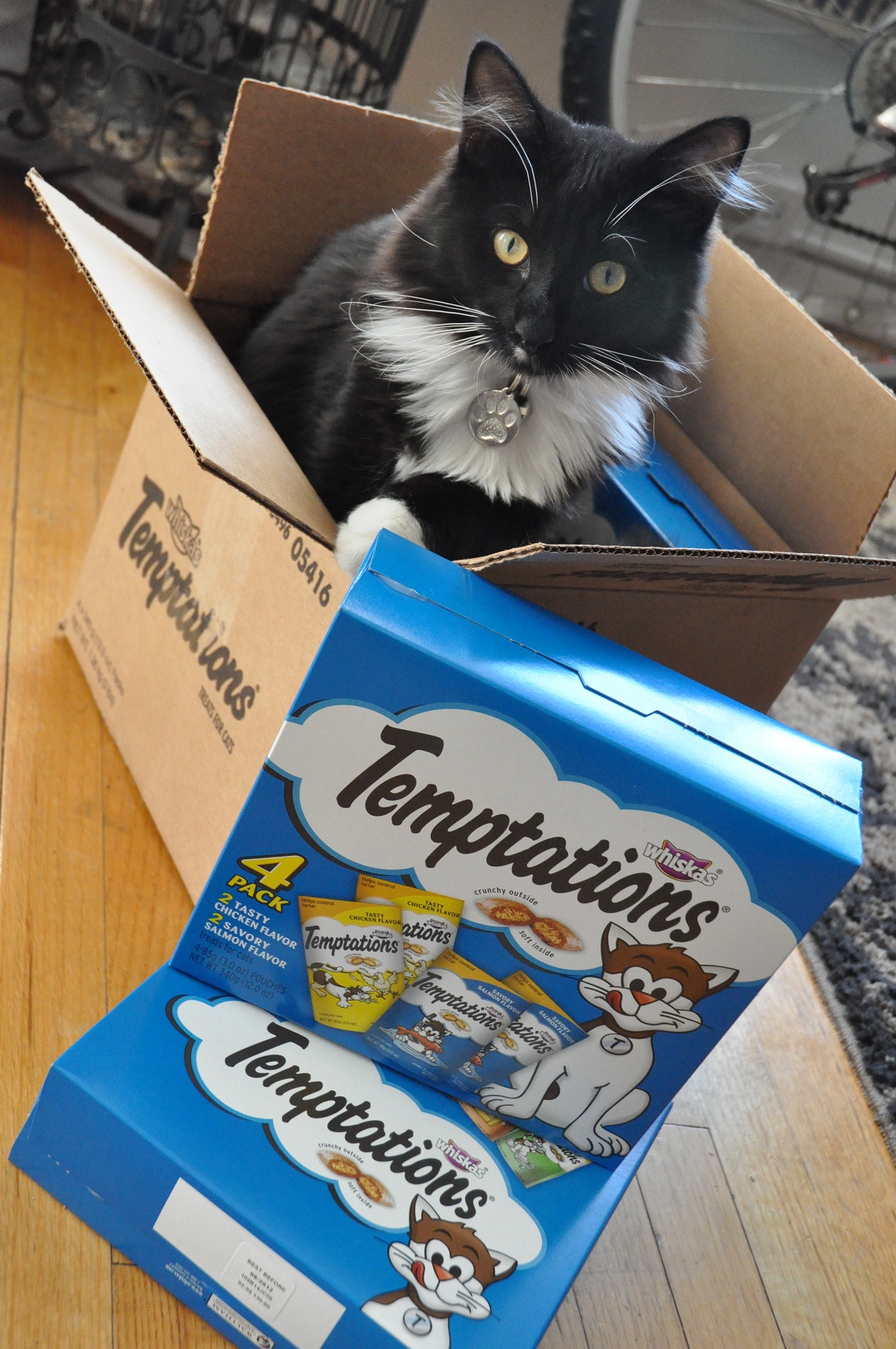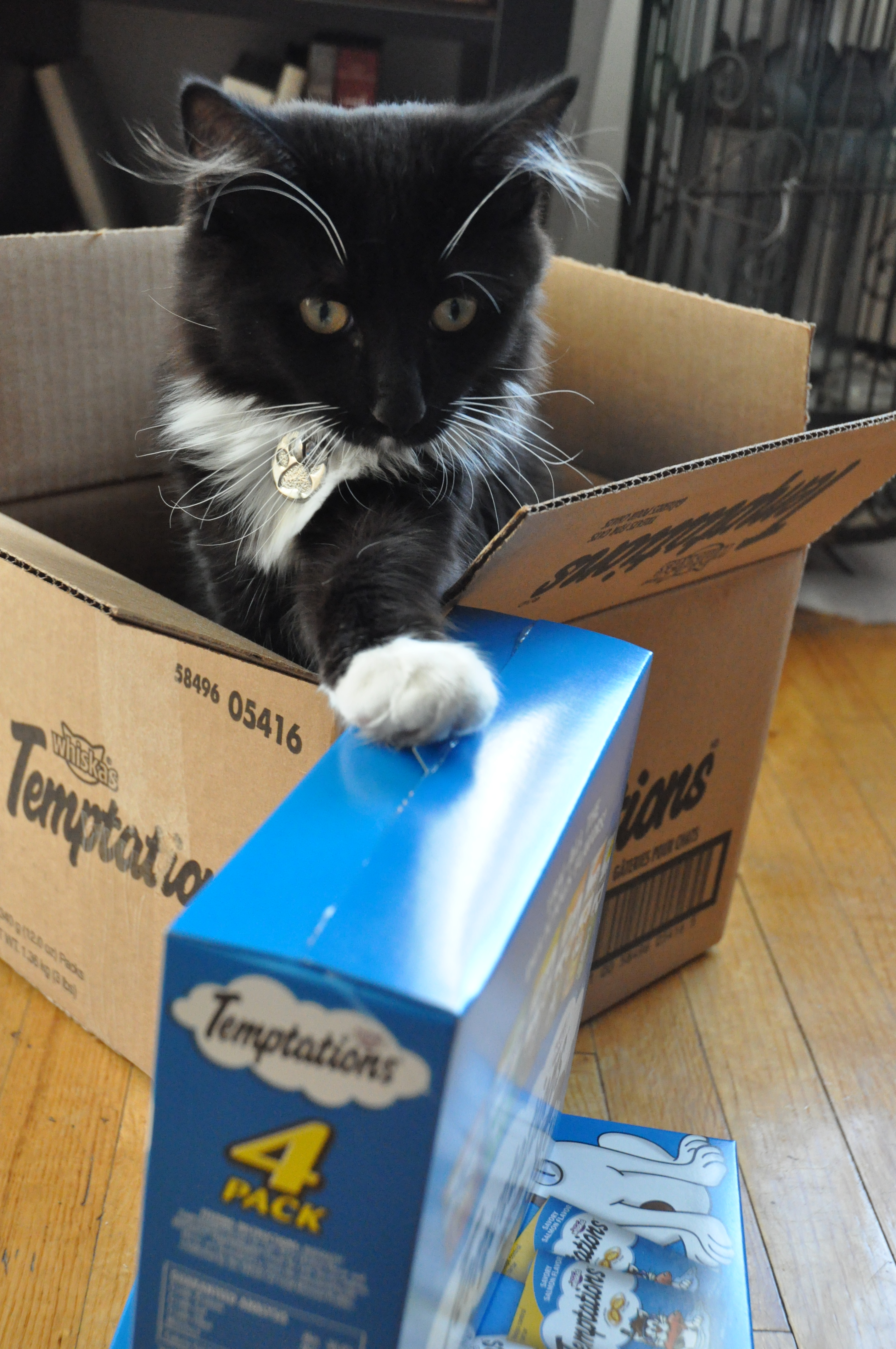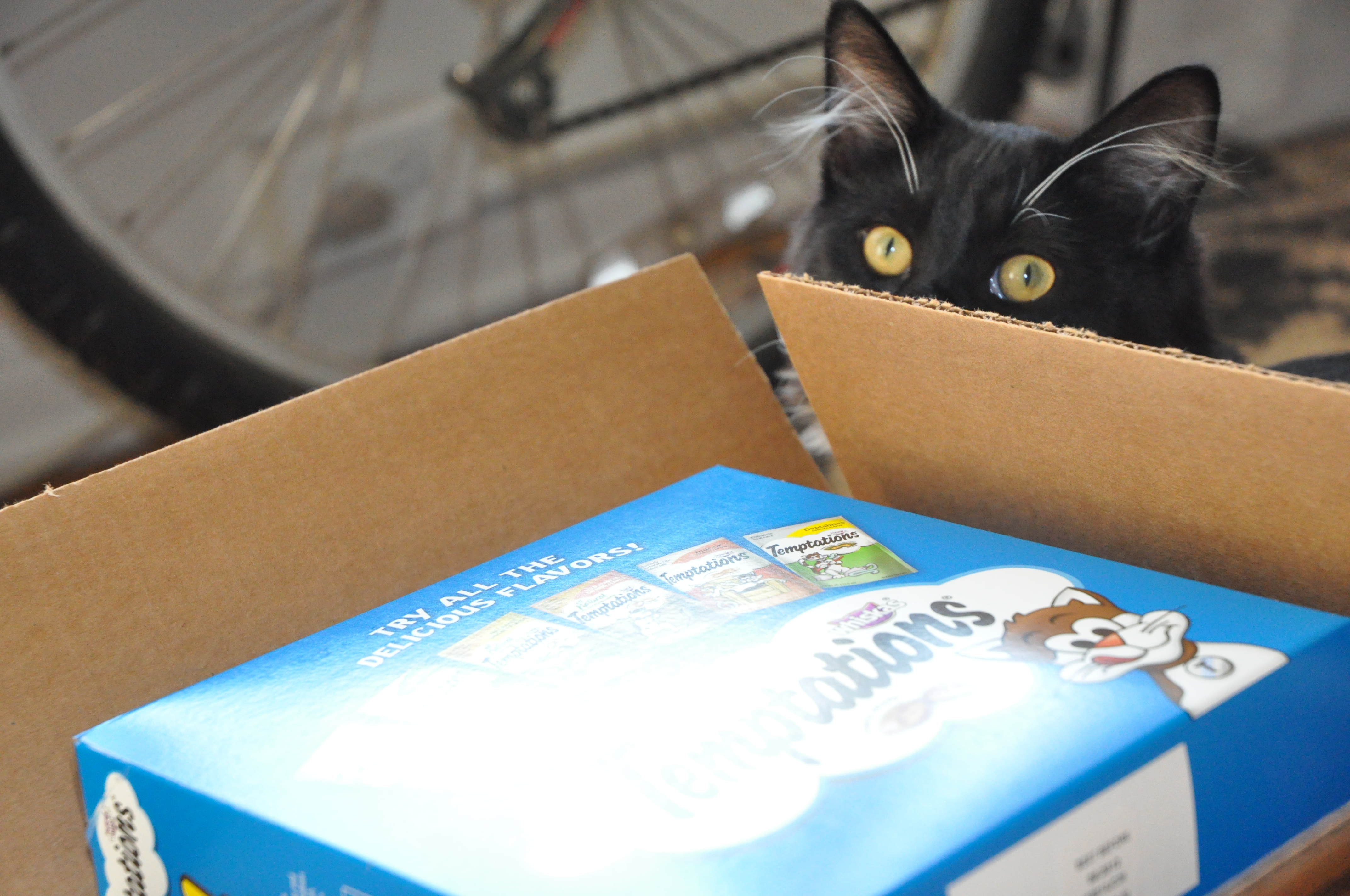 And today Boomer got his first present (I did say he was a popular kitty!!) which was a HUGE box of kitty treats courtesy of our good friend Livvy (aka Smiley_FacEsS on Twitter) …so we obviously took some pics, not only as a Thankyou to Livvy (thankyou, thankyou, thankyou) but so that you can all bask in the warm glow of an explosive little kitty when faced with an insurmountable amount of treats!